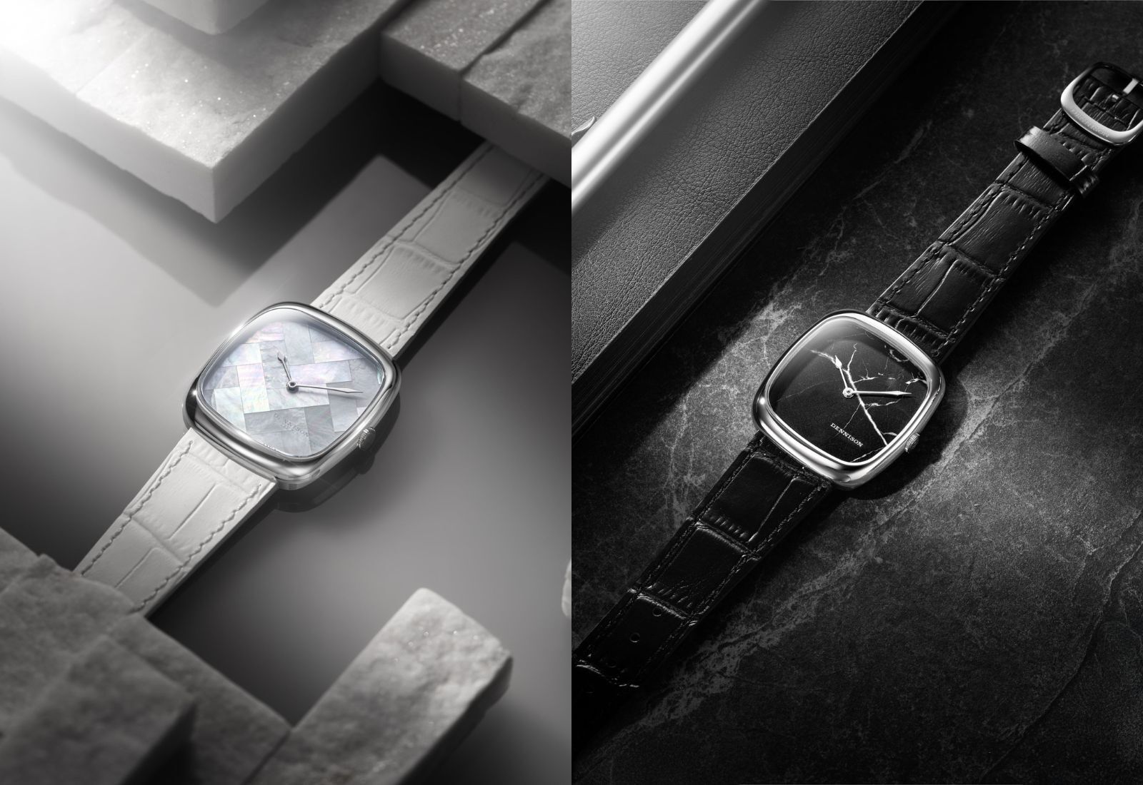 What a sensational year Dennison is having. Back in April, they kind of dominated the Time to Watches show, with everyone talking about their stone dial watches in Geneva. A couple of months later, they did it again, but also kind of sent online watch fans into a frenzy with their dual time ALD model. To top it all off, they won the GPGH Challenge prize, beating out way more expensive and established models. A brand would maybe take it a bit easy until the end of the year. But not Dennison. Because here they are with two new ALD models with new stone dials — one with a black marble dial and the other with a mother-of-pearl marquetry dial.