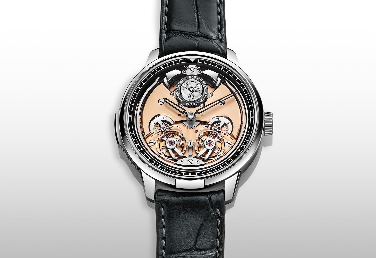 The movement is calibre ARR25, an in-house hand-wound mechanism with 506 components. Unlike the ARR18 in the old Masterpiece, which was co-developed with Le Cercle des Horlogers, the ARR25 is fully Armin Strom's own. Each of the two independent oscillators has its own barrel, gear train, escapement, and balance wheel — the clutch spring couples them without merging them. Most minute repeaters use two hammers and two gongs; the ARR25 uses four of each for a Westminster chime, the four-note sequence you know from clock towers, which divides time into hours, quarters, and minutes. The watch comes on a grey alligator strap with a titanium pin buckle.
