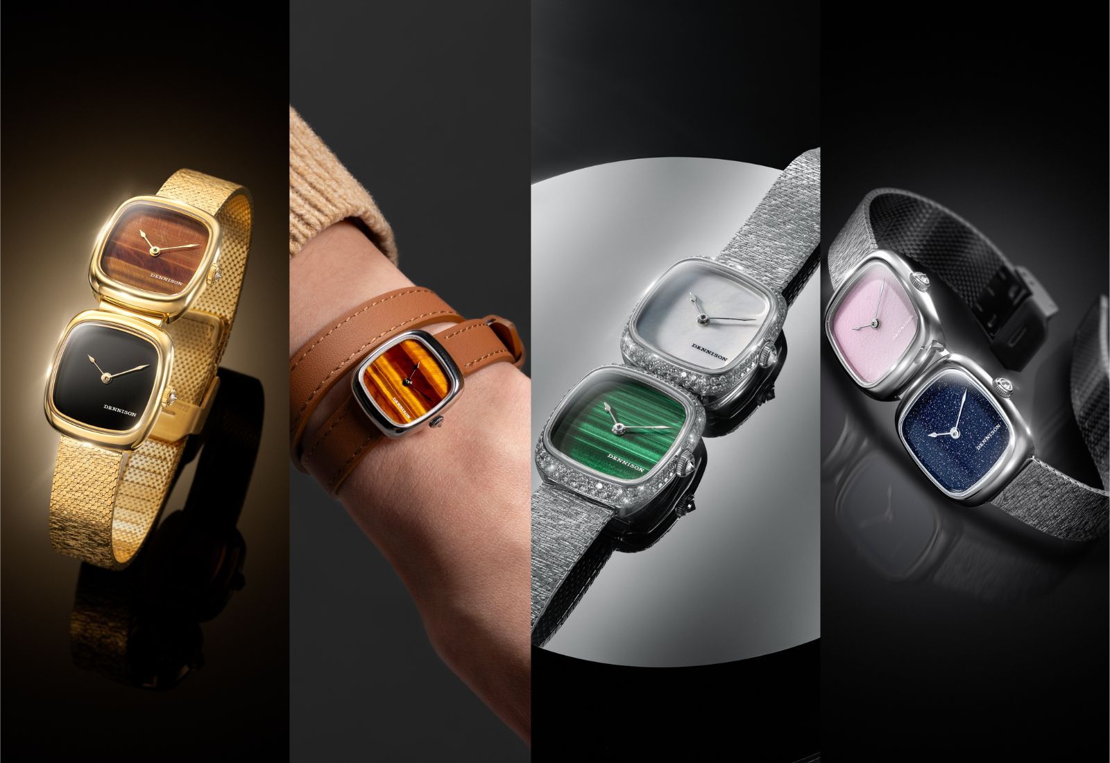 The dial options are all natural stone: Malaysian Pink Jade, Jadeite, Red Jasper, Onyx, Mother of Pearl, Malachite, Tiger's Eye, Lapis Lazuli, and Aventurine. No two are identical. Where things get hilarious is with the Dual Time configuration which stacks two cases one above the other, connected via a quick-release system, so the two displays can be separated and worn independently. Dennison really likes making groovy watches. Dual Time combinations include Red Jasper with Onyx, Jadeite with Lapis Lazuli, MOP with Malachite and Jade and Aventurine.