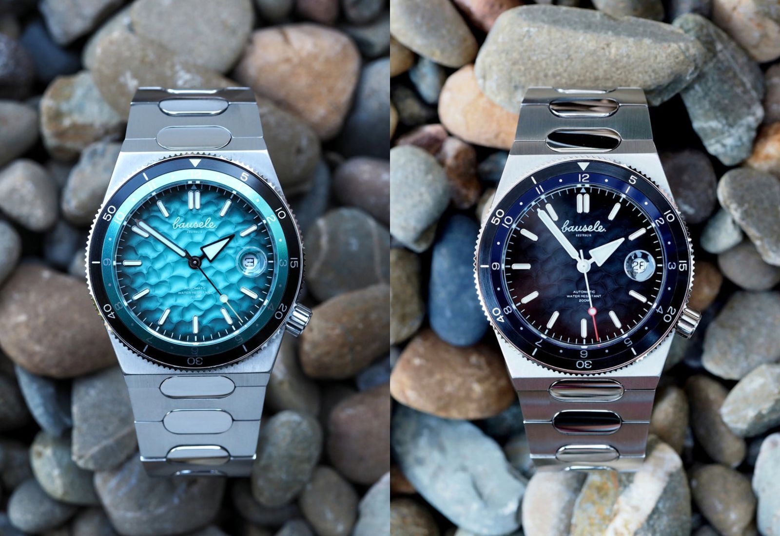 The dials are fantastic. There are two colors to choose from, the Oceanic Blue gets a turquoise dial that fades to almost black on the edges, while the Inferno Black has an almost black purple center of the dial, trailing to a black. Both dials have the same sandwich construction, with the bottom part getting all the color and a wonderful jagged texture. On top of that is a transparent disc that holds the applied indices and Bausele’s logo. There are two more details that differentiate them — since its inception, Bausele watches have had sand from Australia’s beaches embedded in the crowns and these are no different. The Oceanic Blue gets sand from Sydney’s Northern Beaches, while the Inferno Black has black volcanic sand from Currumbin’s Elephant Rock.