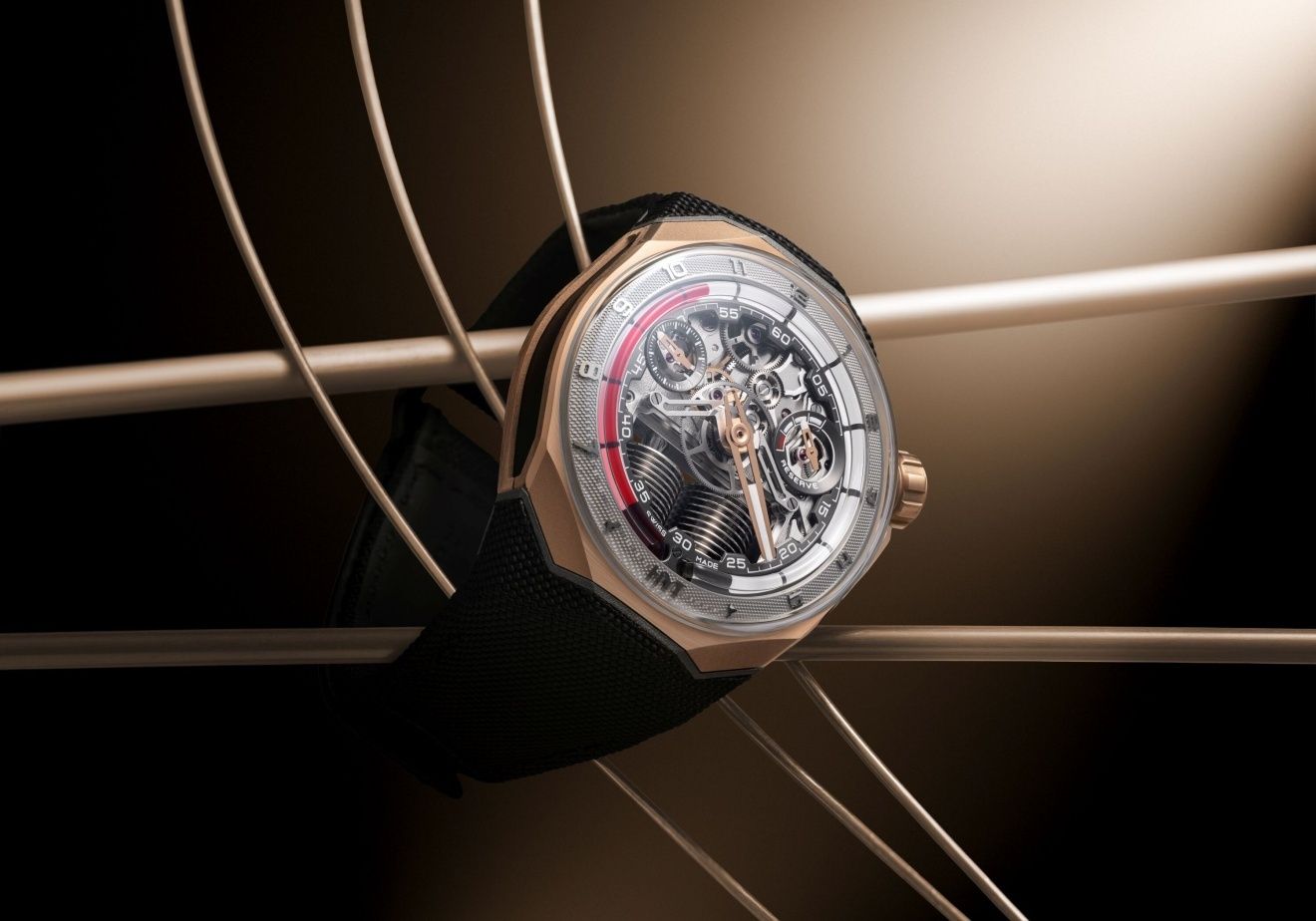 While the numbers of this watch are huge, keep in mind that these have gotten increasingly more wearable. But still, it measures 45.3mm wide, a ludicrous 17.2mm thick and a completely normal lenght of 46.3mm. OK, to be fair, that thickness is needed for the heavily domed crystal. The case is now made out of 5N gold and titanium that has a black DLC finish, and it keeps the very futuristic look, with hollowed flanks, no bezel on top and with a 5N gold crown integrated into the angular case, with crown guards, positioned at 2:30. You also get 50 meters of water resistance, which is great.