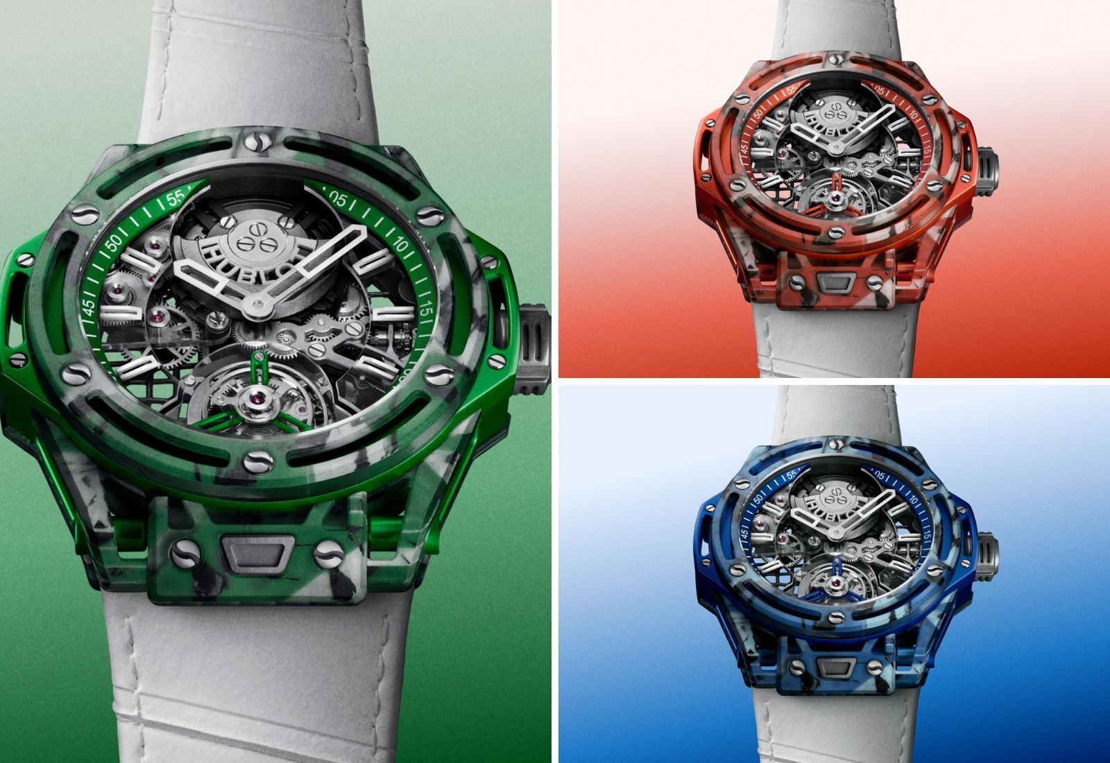 There’s no dial, just a transparent sapphire crystal that exposes the entire movement. What the three have in common are the six satin hour markers with lume blocks in them. The same treatment is applied to the skeletonized hands. The watches also have anodised aluminium flanges and tourbillon cages done in blue, orange or green.