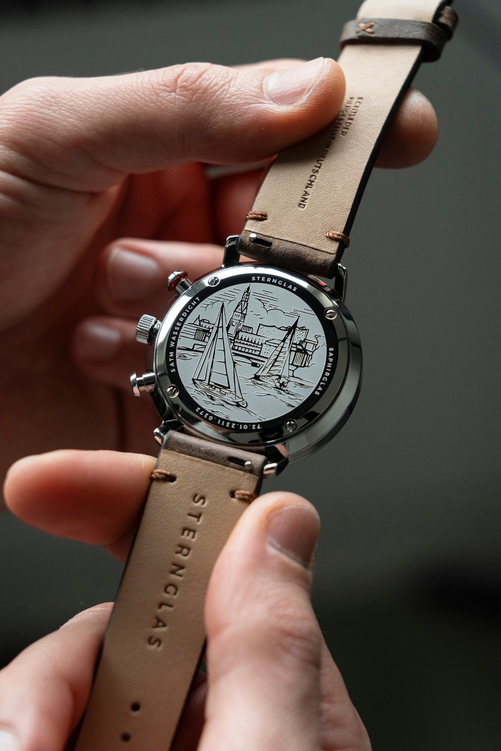 The caseback carries an engraving of two sailboats on the Alster. It is not visible when the watch is on the wrist, which is a minor irony given how much of the design references sailing culture. But the engraving is there, and it is detailed, and it connects the watch to a specific place and tradition in a way that feels earned rather than borrowed. Sternglas is a Hamburg brand. The Alster is their water.