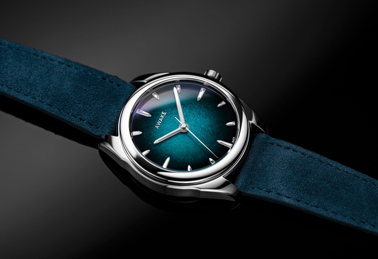 The new dial is made using the same lacquer over silver leaf technique as the original Silver Leaf series, which gives a textured finish, and now all the dials get a fumé gradient that Awake calls a vignette finish. At the center is a bright blue finish, that quickly fades to black, as one would expect in the deep sea. On top of that dial you get the signature hands and applied markers. However, instead of just painting them with lume, the hands and indices are made out of solid blocks of SuperLuminova BGW9, which is then capped with a faceted, polished steel overlay. That gives them both a backglow, which is just beautiful.